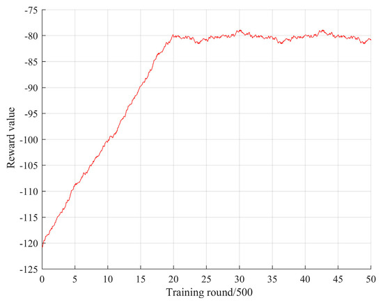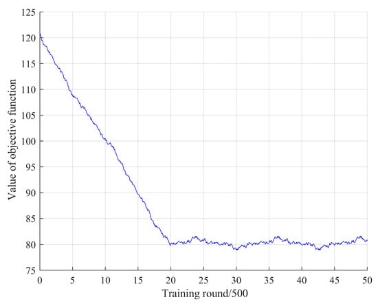 The training samples are input into the neural network successively, and the reward function values of the agents in every 50 s simulation cycle are counted. The reward curve obtained is shown in Figure 12. It can be seen that at the beginning of training, the reward value has been increasing during the agent’s search for actions. With the progress in training, the value of the reward function obtained by the agent converges, and the performance of the model becomes better and better. Figure 13 shows the change curve of the objective function in the training process. It can be seen that the objective function also converges with the progress of training. Finally, the objective function converges to 80.07.