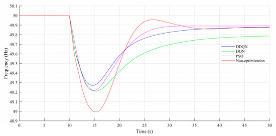A load disturbance of 0.08 p.u. appears in the system after 10 s. Furthermore, the wind penetration level of the system is 10%. The frequency response characteristics of different optimization methods are shown in Figure 14. According to the analysis in Figure 14, it can be seen that the lowest frequency = 49.27 Hz, the inertial response time = 14.37 s, and the steady frequency = 49.88 Hz when using the DDQN algorithm for optimization. When the DQN optimization algorithm is adopted, the lowest frequency = 49.21 Hz, inertia response time = 15 s, steady frequency = 49.79 Hz. When the PSO algorithm is adopted, the lowest frequency = 49.21 Hz, the inertia response time = 14.6 s, and the steady frequency = 49.89 Hz. Without optimization, the lowest frequency = 48.99 Hz, the inertia response time = 15.41 s, the steady frequency = 49.88 Hz, and the overshoot B = 0.16%. The optimization strategy proposed in this paper can significantly improve the inertial response process of the system. Compared with the non-optimized strategy, the lowest frequency increases by 0.28 Hz, reducing the undershooting and oscillatory transients. Also, the response time decreases by 1.04 s.