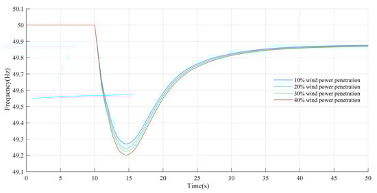The frequency response characteristics of different wind power penetration levels are shown in Figure 15. As we can see from Figure 15, the lowest frequency = 49.27 Hz, the inertia response time = 14.37 s when the wind power penetration level is 10%. The lowest frequency = 49.24 Hz, and the inertia response time = 14.71 s when the wind power penetration level is 20%. The lowest frequency = 49.22 Hz, and the inertia response time = 14.72 s when the wind power penetration level is 30%. The lowest frequency = 49.2 Hz, and the inertia response time = 14.73 s when the wind power penetration level is 40%. With the increase in wind power penetration, the inertia level of the system is reduced. Hence, the lowest frequency is reduced, and the inertia time becomes longer when wind power penetration is increased.