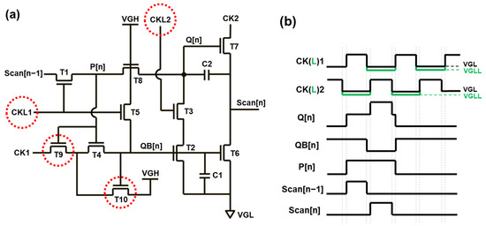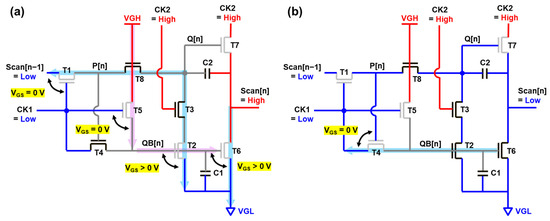 In order to hold-down Scan[n] stably, T6 should remain turned on after the pull-down operation. For this, T5 periodically connects the QB[n] node to VGH and the high QB[n] voltage is preserved by the STT configuration composed of T4, T9, and T10. In addition, T7 should not turn on when CK2 rises. However, when CK2 changes from VGL to VGH, the Q[n] node voltage might momentarily rise due to the capacitive coupling through gate-to-drain parasitic capacitance (CGD) of T7. This situation should be prevented by discharging the Q[n] node voltage to VGL through T2 and T3 when CK2 and CKL2 rise. However, in the conventional MOx 8T-2C scan driver circuit, T2 cannot be turned on strongly because the QB node is discharged through T4 if it has a negative VTH, as shown in Figure 2b. Therefore, T7 may slightly turn on, which leads to the undesirable fluctuation of the Scan[n] voltage. On the contrary, this situation is prevented by the STT configuration in the proposed 10T-2C scan driver circuit, even when T4 has negative VTH.