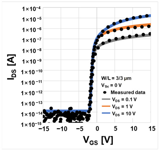 Measured transfer characteristics of n-type MOx TFT and SPICE model with VDS variation from 0.1 V to 10 V when VTH = 0 V.