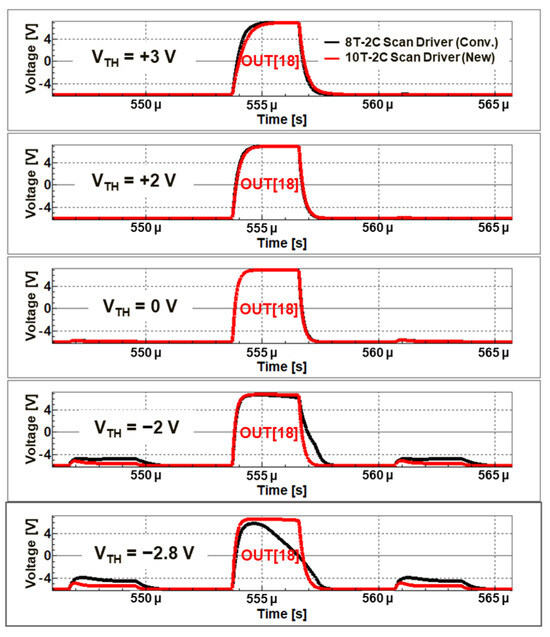 Comparison of SPICE simulation results of the conventional MOx 8T-2C scan driver circuit and the proposed MOx 10T-2C scan driver circuit over a wide VTH variation range of −2.8 V ≤ VTH ≤ +3.0 V.