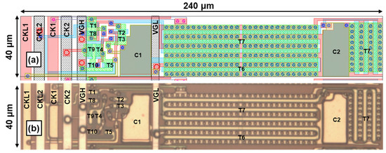 (a) Layout drawing and (b) micrograph showing the unit stage of the proposed MOx 10T-2C scan driver circuit.