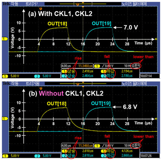 The test sample has twenty stages cascaded and the operation conditions are listed in Table 1. Figure 9a shows the measured output signals of the 18th and the 19th stage. The peak of the output pulse is equal to a VGH of 7 V, as expected, and the low voltage level maintains a VGL of −6 V without ripple for 1 s. The rise and fall times are 2.4 μs and 2.2 μs, respectively. They are longer than the simulation results, possibly due to the large probing capacitance of the measurement system. In addition, instead of CKL1/2, we applied CK1/2 to the gate nodes of T1, T3, and T5 to check the effect of the lower-level clock signals. In this case, the peak of the output pulse does not reach VGH and the rise and fall times increase to 2.7 μs and 2.7 μs, respectively, as shown in Figure 9b. These results can be explained by two reasons: the poor bootstrapping and weak pull-down action of T7 due to the depletion mode characteristics of the MOx TFTs. Since the bootstrapped Q[n] node voltage is not maintained, the output pulse does not reach VGH and the rise and fall times increase compared with the results of Figure 9a. Therefore, it is confirmed that the lower-level clock signals, CKL1/2, are effective in overcoming the depletion mode characteristics of the MOx TFTs.