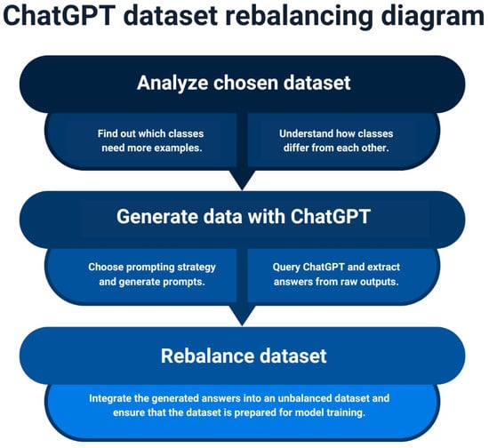 Flow diagram showing the three stages of dataset rebalancing with ChatGPT: (1) analyzing the dataset and choosing classes for synthetic data generation; (2) choosing prompting strategy, querying (prompting) the ChatGPT service, and extracting answers; (3) rebalancing the dataset by integrating extracted answers.