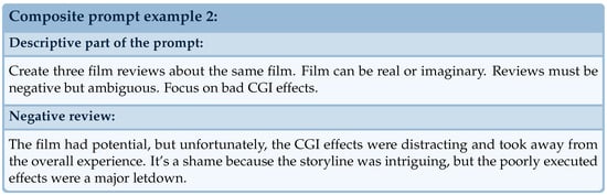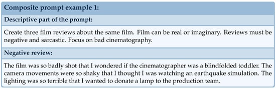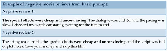 The system message helps set the behavior of the assistant, even if, in the OpenAI documentation, it was written at the time that the GPT-3.5-turbo model does not pay strong attention to system messages. The user message is the main instruction that explicitly defines the task for the model and outlines how it should structure the output. Examples of two reviews generated by using basic prompts can be seen in Figure 5.