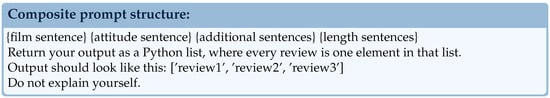 Our work utilizes the IMDB [47] movie reviews dataset, which we describe in detail in Section 2.3.1. We generated synthetic movie reviews using the official OpenAI API specifically by employing the GPT-3.5-turbo model used by ChatGPT. We set the temperature of the chosen model to 0.8, as it is commonly assumed that ChatGPT has a model temperature set to be around 0.6–0.8. The procedure consisted of dataset analysis, prompt engineering, prompt generation, querying the API, results processing, and dataset rebalancing, as shown in Figure 4.