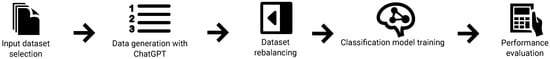 Overview of general experimental setup. It consists of five consecutive steps: selecting the primary dataset, data generation using ChatGPT for unbalanced classes, dataset rebalancing with synthetic data, classification model training, and performance evaluation.