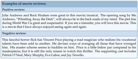 - Maas, A.L.; Daly, R.E.; Pham, P.T.; Huang, D.; Ng, A.Y.; Potts, C. Learning Word Vectors for Sentiment Analysis. In Proceedings of the 49th Annual Meeting of the Association for Computational Linguistics: Human Language Technologies, Portland, OR, USA, 19–24 June 2011; pp. 142–150. [Google Scholar]
