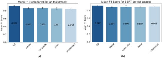 When considering the 10% unbalanced experiments, the “Composite 10%” configuration emerged as the top performer in the F1 score, as illustrated in Figure 12a. This suggests that composite prompts might be valuable when dealing with a significant class imbalance. However, a peculiar finding is that in the 20% unbalanced experiments, the unbalanced dataset itself, ironically, outperformed the other methods. This result raises an intriguing hypothesis: beyond a certain threshold, allowing the dataset to remain unbalanced might be preferable to introducing potential noise through synthetic data generation.
