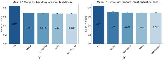 The performance of the Random Forest classifier diverged noticeably from the full dataset compared to the other unbalanced experimental setups. Interestingly, for both the 10% and 20% unbalanced datasets, the similarity prompts approach outperformed the other methods, which is particularly evident in the F1 score, as shown in Figure 13.