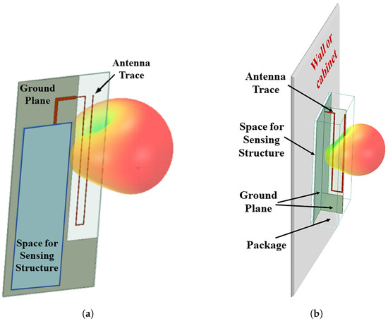 With the advancement of the Internet of Things (IoT), smart sensing systems have become essential for home and industrial applications [1]. These systems are used for improving safety, monitoring the environment, and controlling the status of all parameters [2,3,4]. Key features necessary in the development of wireless sensors are low fabrication cost and small footprint. An antenna, as one of the largest components in sensing architectures, needs to be appropriately designed to perform well and to be cost-effective. Basically, sensor tags can be either active or passive. In the active sensors design, the sensor needs a battery to be functional, which leads to higher design complexity [5]. However, with the help of the battery power, the sensor can provide a longer reading range with a small antenna. Therefore, the antenna profile is not a challenging issue in the design of active sensors, while in battery-less wireless sensor nodes, or passive ones, the antenna is required to be low-profile with a suitable radiation gain [6].