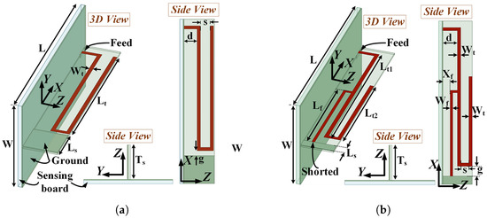 Monopole antennas with sensing circuits: (a) antenna with in-plane ground, and (b) antenna with vertical ground.