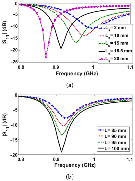 The Effect of length of ground plane on resonant frequency in designing narrow-band antenna, (a) different Ls while L = 100 mm, and (b) different L and Ls while L − Ls = 81.5 mm.