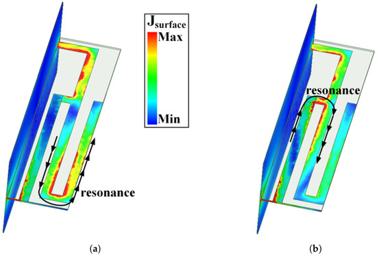 Surface current of the wide-band monopole antenna at (a) first resonant frequency (873 MHz) and (b) second resonant frequency (938 MHz).