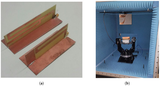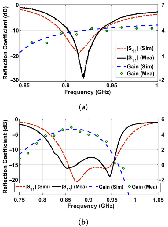 Figure 8a shows fabricated prototypes of the proposed narrow-band and wide-band monopole antennas for UHF RFID sensing applications. To examine the performance of the proposed antennas, the reflection coefficients of the fabricated antennas are first measured by a Vector Network Analyzer (VNA). As shown in Figure 9, the measured bandwidth of the proposed narrow-band antenna is from 902 MHz to 939 MHz (%4), which covers the desired RFID band of North America. The antenna pattern measurement tests were conducted in a near-field anechoic chamber, as shown in Figure 8b. The test setup included a precision scanning system and a vector network analyzer that collected the antenna’s electromagnetic field in the near-field. The far-field radiation pattern of the antenna was calculated using the collected near-field data and a transformation algorithm. The gain plot shows that the gain at the center frequency is 4.2 dB for the narrow-band antenna and is 4.9 dB for the wide-band one. Thus, the realized gains could be easily calculated by multiplying the gain plots by the efficiency plots of Figure 7, giving 4.0 dB for the narrow-band and 4.6 dB for the wide-band.