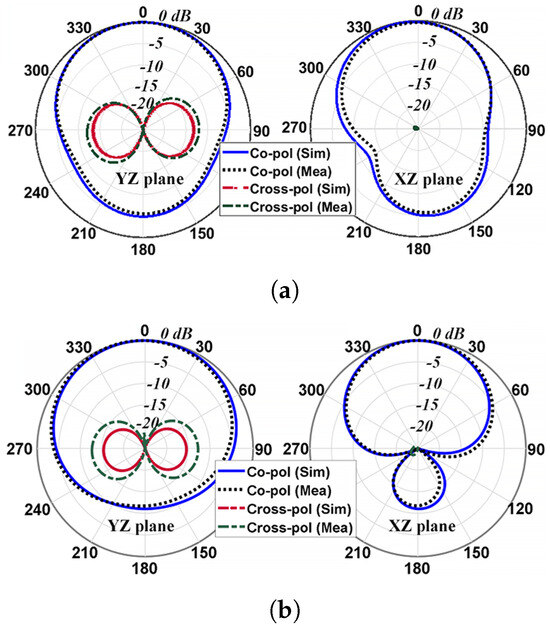 Similarly, as shown in Figure 9b, the measured bandwidth of the wideband antenna is over 822–961 MHz (%15.6), which covers the worldwide UHF RFID band. All simulation and measurement results are in good agreement. The slight difference between simulation and measurement results may be due to the fabrication tolerance. To investigate the radiation performance of the proposed antennas, the radiation patterns of the antennas are measured. The simulated and measured antenna gains for both antennas are plotted in Figure 10. It is evident that the antennas do not show significant backward radiation, caused by the presence of the ground plane. Figure 10 depicts the simulated and measured radiation patterns of both antennas in the YZ plane () and XZ plane () at 915 MHz. As seen, the half-power beam widths (HPBWs) of the YZ plane and XZ plane are and for the narrow-band antenna and and for the wide-band antenna, respectively. This shows the great coverage of the proposed antennas in the YZ plane, which is of great importance in RFID sensing applications, as discussed before. Also, for the narrow-band antenna, the measured cross-polarization levels within the HPBWs of the YZ plane and XZ plane are at least 10 dB and 22 dB below the corresponding measured co-polarizations, respectively. For the wide-band antenna, in the YZ plane and XZ plane, the measured cross-polarizations within the HPBWs are nearly 9.5 dB and 22 dB under the corresponding measured co-polarization levels. These results show the linearity of the polarization of both proposed monopole antennas.