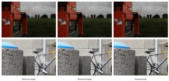 The traditional defocus deblurring methods first estimate the defocus map of the defocused image [2,3,4], and then use the defocus map to perform non-blind deconvolution [5,6,7,8,9] to rehabilitate a sharp image. Because the performance of the former approaches completely depends on the accuracy of the defocus map, therefore, considerable effort has been made to improve the accuracy of the defocus map [10,11,12]. In addition, Andres et al. [13] proposed a new method to estimate the spatially varying defocus blur and then used local frequency image features and regression tree fields to train their model to obtain a coherent defocus blur map. Liu et al. [14] proposed a new method to estimate the parameter of the Generalized Gaussian kernels from image patches for non-blind image deblurring. Goilkar et al. [15] proposed blind and non-blind deconvolution techniques for the restoration of a defocused image. Chan et al. [16] used blind deconvolution to estimate the blur kernel and then used total variation minimization to recover the background and fuse it with the foreground to obtain a sharp image. However, the aforementioned methods not only require intensive computation but also end up with unsatisfactory results by reason of the inaccurate defocus map.