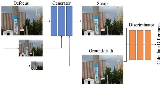 where represents the original defocused image. and represent the generator network and discriminator network, respectively.