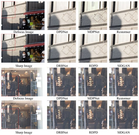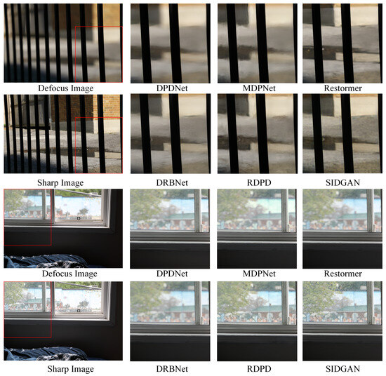 Figure 5 shows the visual results of different defocus deblurring methods on the DPDD dataset. From the first large blurry image, it is challenging to determine whether it is a cement floor or a stone floor. In order to provide a better viewing experience, we crop the image into small blocks and then present the corresponding sharp images processed by different methods. From the second image of the first group, we can see that the image is still smooth and it contains many artifacts on the wall and the floor after processing by DPDNet. The image processed by MDPNet not only becomes very smooth but also contains a lot of noise and artifacts. From the fourth image of the first group, it is apparent that Restormer achieves good visual effects, but the texture is not clear enough and there are many artifacts on the floor. Compared to Restormer and our SIDGAN, the results of DRBNet and RDPD are still smooth and there are many artifacts on the floor near the wall. From the final image of the first group, we can see that our method not only restores rich texture from the defocused image but also contains less noise and fewer artifacts than others. From the second group of Figure 5, it can be perceived that other methods cannot restore the window screen well and deblur effectively. However, our method not only restores the window screen effectively but also makes distant houses clear and makes our result contain fewer artifacts than others. In summary, our SIDGAN obtains better visual results, whereas most other methods will fail when they encounter large blurry regions.