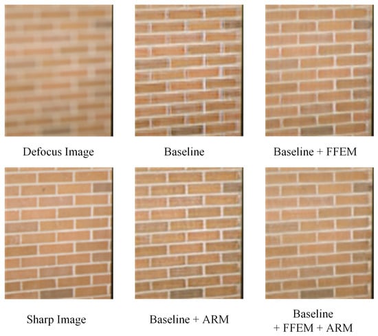 In addition, the visual results of our SIDGAN equipped with various modules on the DPDD dataset are illustrated in Figure 7. Overall, no matter which module is employed, the visual results of the defocused image are improved. However, some modules cannot eliminate artifacts effectively. For instance, there are many artifacts near the brick joint in the image processed by the baseline. The main reason is that the first image is severely blurry and the baseline is unable to effectively extract features. After adding the FFEM to the algorithm, we obtain a clearer image with less noise as shown in the final column. The improvement in visual effects is mainly due to the feature extraction ability of the FFEM. Although the FFEM can further improve image quality, there are many artifacts near the brick joints. Therefore, in order to eliminate these artifacts, a new ARM is put forward. From the fifth image in Figure 7, we can see that a lot of artifacts near the brick joints are eliminated. When the FFEM and the ARM, as proposed in this paper, are added simultaneously, the algorithm is capable of not only restoring structural contents and textural details but also preserving the spatial smoothness of the homogeneous regions.