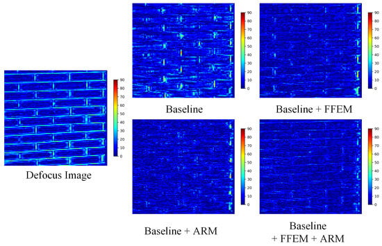 In Figure 8, we also provide the error maps of each module on the DPDD. The brighter the color, the larger the error. In general, the baseline, the FFEM, and the ARM are able to recover more details from the defocused image. From the left image in Figure 8, we can see many brighter pixels across the image, and the pixels near the brick joints are especially bright. The previous phenomenon indicates a significant error between the defocused image and the high-definition image. In a word, the first image in the second column of Figure 8 demonstrates that the error is reduced in comparison with the error map of the defocused image. Overall, from the first image in the final column of Figure 8, we can discover that the brighter pixels are further decreased in comparison with the baseline after adding the FFEM. From the first image in Figure 7 and the left image in Figure 8, it is easy to find that the defocused image contains large blurry regions. The previous observations indicate that the FFEM can enhance the feature extraction ability of our method when the input is a defocused image with large blurry regions. Compared to the preceding error maps, the ARM further reduces errors between the sharp image and the reconstructed image. From the final image in Figure 8, we can discover that it has the least number of brighter pixels among the five error maps, which indicates that the FFEM and the ARM are conducive to recovering high-quality images from defocused images.