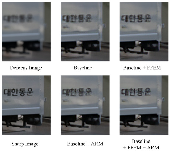 As illustrated in Figure 9, the visual results of the SIDGAN equipped with different modules on the RealDOF dataset are exhibited. From the first image, it is difficult to read the writing on the carriage. After processing by our method, the text on the carriage is clear and visible. Compared to the original defocused image, the image quality of the baseline shows a slight improvement, as seen in the first image of the second column in Figure 9. From the first row of the final column, it can be seen that the image quality is further improved after adding the FFEM. By comparison with the original defocused image, we can see that the visual effect is improved again after adding the ARM. In a word, the quality of the image processed by SIDGAN equipped with the FFEM and the ARM is the best of all.