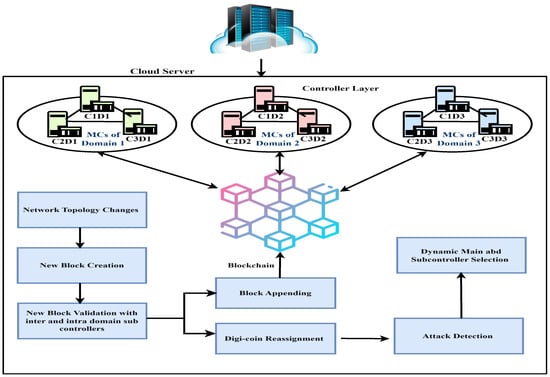 The multi-controller SDN comprises several controllers that can work together to efficiently manage the traffic flow with a consistent network view over large-scale dynamic networks [26]. Sudden changes in the controller states should affect the performance of the new configuration flow of other controllers in the network, resulting in poor network performance. Also, the multi-controller SDNs are vulnerable to attacks such as false injection, a man in the middle, and compromised controllers. Thus, it ultimately impacts the entire performance of multi-controller SDN. Hence, efficient security is needed to protect the controllers against attacks and single-controller failure. Blockchain technology has proved as a promising security solution to mitigate MC-SDN security attacks, especially man-in-the-middle. Thus, it ultimately impacts the performance of multi-controller SDN. Detecting and mitigating the effects of attacks in an MC-SDN environment is crucial to maintaining the security and integrity of the multiple controllers. Also, efficient security is needed to protect the controllers against attacks and single-controller failure. To rectify the abovementioned issues and improve the security of multi-controller SDNs, this work intends to present a blockchain-enabled control plane security strategy named BCS. The main intention of the proposed BCS is to deliver distributed decentralized attack detection, providing strong security against multi-controller SDN systems by integrating the advantages of blockchain technology. The BCS design is explained in the following Figure 3, and it includes three mechanisms for the security of the multi-controller communication, the proposed model considers the work in [26] as a base model. Instead of assigning redundant controllers from the available controllers such as [26], the proposed BCS includes two redundant sub-controllers to the corresponding domain. Thus, it effectively handles the controller failure issues due to high load and optimizes the resource consumption among the controller without increasing the overhead.