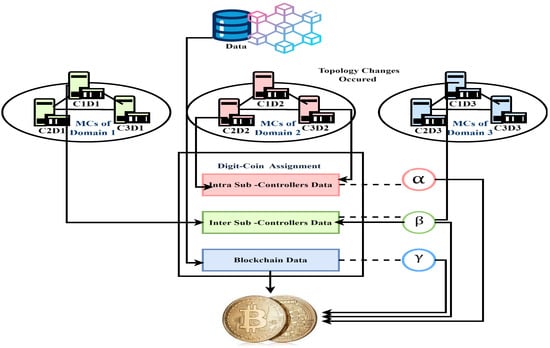 The BCS permits the nodes with high digit-coin to read and write the permissions of the proposed blockchain. During network initialization, each controller is considered a genuine node. After some rounds, the Genuity of the controllers is revised based on the digit-coin value. Thus, the proposed BCS can rectify the effects of compromised controllers in consensus participation. The main and sub-controllers of each domain are depicted in various colors. As shown in Figure 4, the controller C1D2 incurs flow changes and needs to update the corresponding changes to the main controllers C1D1 and C1D3 of other domains. Therefore, it inaugurates the digit-coin assignment system in which the monitored data of intra and inter-controllers are jointly considered with the blockchain historical data. The digit-coin system estimates the digit-coin of C1D2 () using Equation (1).