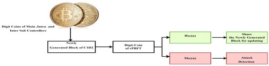 In Equation (1), the factors are weighting values of intra-sub-controller locally observed data. , inter sub-controller locally observed data , and blockchain historical data (). The summation value of weighting factors equals 1. The BCS assigns dynamic weighting values between 0 to 1 based on the behavior of the intra and inter-controllers in previous communications. Moreover, the BCS provides the to rPBFT consensus to validate its newly created block. Consequently, the BCS initiates the block validation using the reputed rPBFT process. The digit-coin assignment process is explained in the following Algorithm 1.