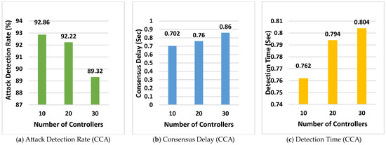 Figure 7c shows the relationship between the number of controllers and detection time for the CCA scenario. The BCS increases the detection time when varying the number of controllers from 10 to 30. This is caused because the percentage of CCA is high under 30 controller scenarios compared to 10 and 20 controller scenarios since the BCS needs adequate time to defend against the compromised controllers. For example, the BCS obtained 0.804 s of detection time for 30 controller scenarios.