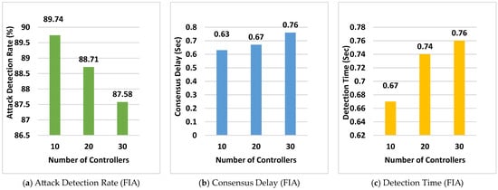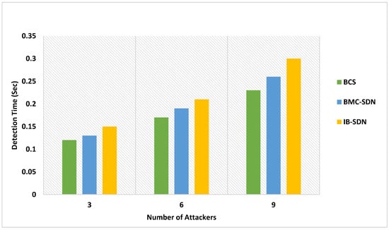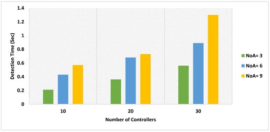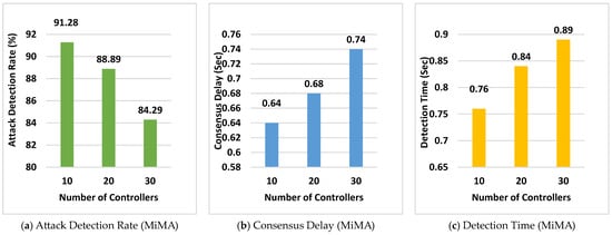 Figure 9c plots the detection time results obtained for MiMA under various numbers of controllers. The BCS improves the detection time when varying the number of controllers from 10 to 30. The reason is that the BCS has to defend against the high number of MiMA under a high controller scenario. Thus, it increases the detection time under a high number of controllers present compared to a low number of controller scenarios. For instance, the BCS attained 0.76 and 0.89 s of detection time, respectively, for 10 and 30 controllers.