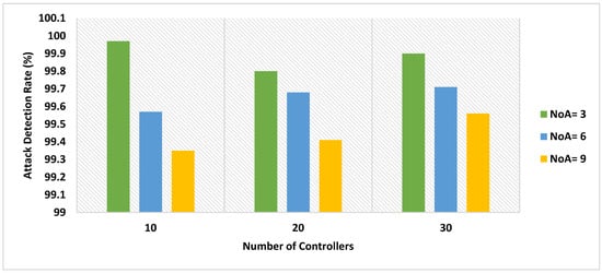 Figure 10 portrays the attack detection rate results of BCS obtained for the number of attackers (NoA) = 3, 6, and 9. To evaluate the performance efficiency of the BCS security model under different scenarios, the number of controllers was varied from 10 to 30. The attack detection rate slightly increased with varying the number of domains and controllers from low to high. The reason is that the increasing number of domains also increased the number of controllers, resulting in efficient intra and inter-sub-controller monitoring. Thus, it increases the efficiency of digit-coin computation accuracy and improves the attack detection performance. The proposed BCS detects malicious behaviors based on three pieces of information: intra-sub-controller data, inter-sub-controller data, and blockchain data. The maintenance of digit-coin values as blockchain ledgers increases the security level of the proposed system. For example, the BCS accomplished 99.35% and 99.56% attack detection rates under 10 and 30 controllers, respectively, where NoA = 9.