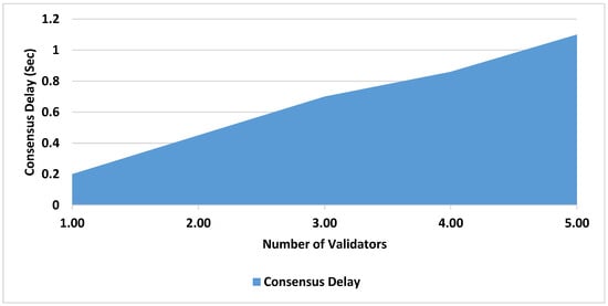 The consensus delay performance of rPBFT of BCS is demonstrated in Figure 12. Generally, the number of validators has some delay effect on the rPBFT consensus. The proposed model utilizes a digit-coin blockchain system where genuine miners are fairly involved in block creation and validation. Unlike fundamental PBFT, the rPBFT optimizes the miner selection process using digit-coin values. It selects an adequate number of genuine miners and performs equally to all the selected miner controllers during block validation. Thus, it minimizes the consensus delay and decreases overhead compared to existing PBFT. Also, it exploits various numbers of intra and inter-club-controllers in the consensus process, resulting in some consensus delays with secure mining. For example, the BCS accomplished 0.2 and 1.1 s of consensus delay for 1 and 5 validator scenarios, respectively.