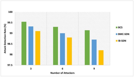 Figure 13 portrays the attack detection rate of the proposed BCS, existing BMC-SDN, and IB-SDN. The proposed BCS model varies the number of attackers from 3 to 9 to show its superiority over existing BMC-SDN. Both models decrease the attack detection rate by adjusting the number of attackers from low to high. The reason is that both models consider the redundant controller monitoring information in attack detection, and most of the redundant controllers are malicious under the high malicious scenario. For instance, the proposed BCS accomplished a 99.54% and 99.14% attack detection rate for 3 and 9 attacker scenarios, respectively. However, the attack detection rate of the proposed BCS is better than the existing BMC-SDN and IB-SDN, as the proposed model includes the monitored data of both intra and inters controllers in attack detection. Unlike this, the existing BMC-SDN only includes the inter-controller reputation values for attack detection, resulting in a minimum attack detection rate. The IB-SDN exploits global trust maintenance among the distributed controllers, and it is unable to minimize the compromised controller effect in the network. For example, the BCS enhanced the attack detection rate by 0.3% and 0.9% compared with existing BMC-SDN and IB-SDN, respectively, when nine attacker nodes were presented in the network.