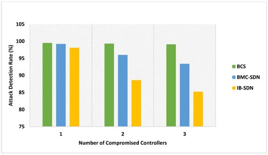 Figure 14 illustrates the comparison of attack detection rate results of BCS, BMC-SDN, and IB-SDN. To show the superiority of BCS under multiple numbers of compromised controllers, the number of compromised controllers is varied from 1 to 3. The results demonstrate that all three works decreased the attack detection rate when adjusting the number of compromised controllers from low to high. For instance, the proposed BCS decreased the attack detection rate by only 0.4% by adjusting the compromised controller number from 1 to 3. However, it was minimal when compared with the attack detection rate results of BMC-SDN and IB-SDN. The reason is that the proposed model includes the advantage of inter and intra-controller monitoring strategy in the reputation estimation of the main controller. Although the BMC-SDN also includes the redundant controller structure to mitigate the compromised controller effect, it fails when multiple numbers of controllers within a domain are compromised. The IB-SDN fails to provide defense against compromised controller scenarios. For instance, the BCS minimized the compromised controller effects while improving the attack detection rate by 5.7% and 13.9% compared with BMC-SDN and IB-SDN, respectively, when three compromised controllers were present in the scenario.