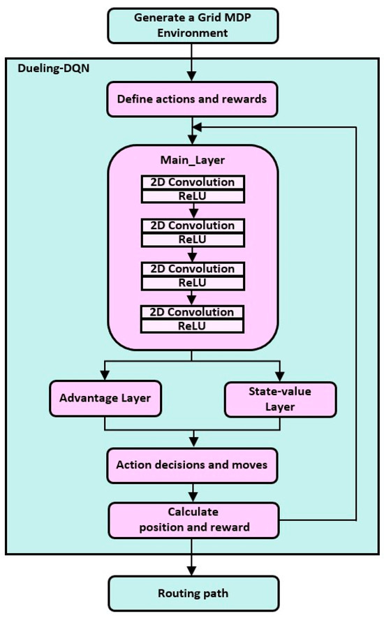 3.1. Overall Structure of the Dueling-DQN-Based Routing Algorithm