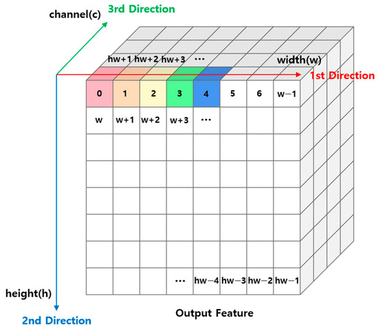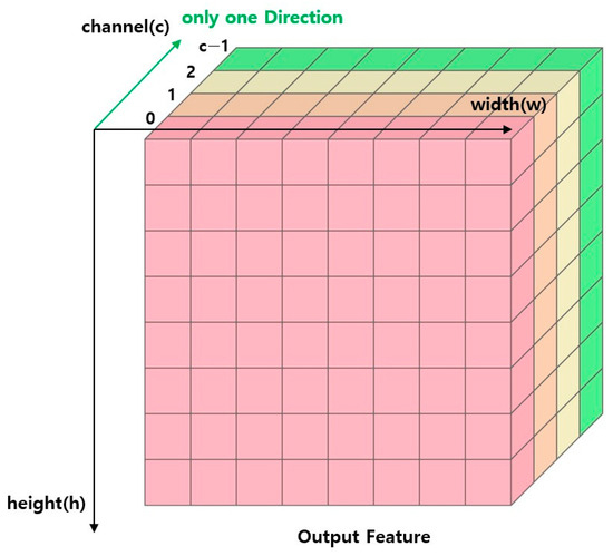 Figure 2 shows a schematic representation of the process and direction of the operation described above. The color change of the block means the direction of the operation. The iterative structure described above calculates one feature of the output and moves on to the next feature when the previous calculation is finished. In this paper, we propose a method to avoid loop dependency by calculating the value of all features belonging to a channel simultaneously based on one channel, rather than calculating one feature with a dependency on the output. Figure 3 shows a schematic representation of the sum-pooling method proposed in this paper.