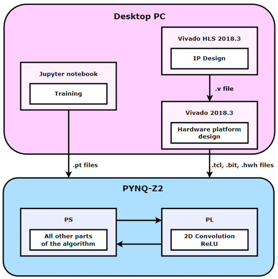 In addition, for the heterogeneous device co-design of CPU and FPGA, the Board of PYNQ-Z2, which has both PS and PL, was selected. The PYNQ-Z2 is based on the ZYNQ XC7z020-1CLG400C chipset, which includes a 650 MHz ARM Cortex-A9 dual-core processor and an Artix-7 level FPGA. Figure 4 shows the real experimental environment as configured. The FPGA development platform was Xilinx Vivado HLS 2018.3, Vivado 2018.3. First, the code for parallelization was configured in Vivado HLS 2018.3, and the .v file containing the IP information was extracted by synthesizing the configured code. The previously developed IP was then imported into Vivado 2018.3 to design the entire hardware platform. Finally, the .hwh, .tcl, and .bit files containing information about the hardware platform were extracted. PYNQ also provides various tools and libraries, of which we used the overlay library to develop through python. Figure 5 shows the development flow described above schematically.