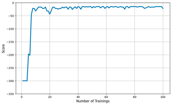 The training results of Dueling-DQN in the environment described above are as follows. First, the starting position of the agent was fixed to (2,2), and the target position was fixed to (10,10). The training was executed a total of 100 times, and the training results are shown in Figure 6. From Figure 6, it is seen that at the beginning of the training, the agent repeatedly obtained the lowest score of −300, but after the initial score, it gradually found the path over time. In the experiment, at the 40th training, the best point (shortest path) was obtained for the first time and eventually converged to the best point.