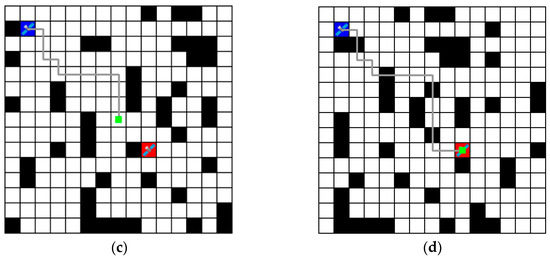 Figure 7 shows these results in a grid environment, where blue represents the agent, red represents the goal location, black represents the obstacles (link disconnections), and the gray line represents the path obtained. In Figure 7b,d, there is a collision between the obstacle and the path; however, this can be ignored, as the path that was free of obstacles at the time of movement is marked with dynamically moving obstacle positions. As a result, the routing algorithm based on the Dueling-DQN obtained the shortest path.