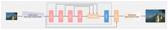 In this subsection, we investigate feature extraction. It includes low-level feature extraction and multi-scale global feature extraction. Given a low-resolution input image , where is a three-dimensional real space of number of channels, height, and width: , , and correspond to the number of channels, the height, and the width of the input image, respectively, and we first use a convolutional layer of 3 × 3 to extract the low-level features of the image, which can be mathematically written as follows: