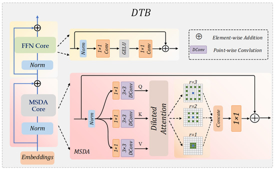 Features at different scales contain information about different details in an image. To model feature long-range dependencies and interact with information at multiple scales, we design a dilated transformer block (DTB) shown in Figure 3. It includes a multi-scale dilated attention (MSDA) and a feed-forward network (FFN). The flowchart of DTB is shown in Figure 4 and consists of the following three modules.