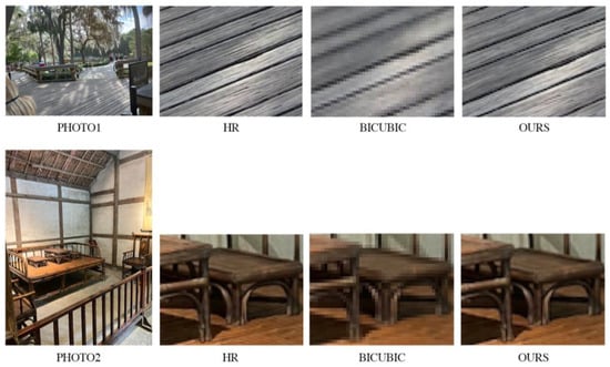 While the DAIR model has shown promising results on the datasets used in this paper, its performance in real-world scenarios with diverse and unpredictable image conditions remains to be tested. To evaluate the applicability of the proposed method under real-world conditions, we conducted additional experiments using images taken from different environments and under different lighting conditions. Figure 6 shows the results where HR indicates the images from the photos taken, BICUBIC stands for the images reconstructed using bicubic interpolation, and OURS indicates the images reconstructed with our proposed method. The images in Figure 6 highlight the DAIR model’s effectiveness in real-world scenarios, confirming its robustness and applicability for practical image enhancement tasks.