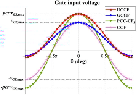 and is the input voltage amplitude that just reaches the saturation point. Figure 2 depicts states of the gate input voltage waveform for various modes. As shown in Figure 2, the gate input voltage of the continuous class F (CCF) mode is an ideal cosine wave where equals and equals 1. The GCCF mode achieves the finite third-harmonic load impedance by expanding , and in this mode, is equal to 1. The mode achieves the finite third-harmonic load impedance by inputting an overdriven gate voltage, and in this mode, is equal to . To leverage the advantages of both modes, the UCCF mode combines and to reshape the drain current waveform. The GCCF and modes are special cases of the UCCF mode.