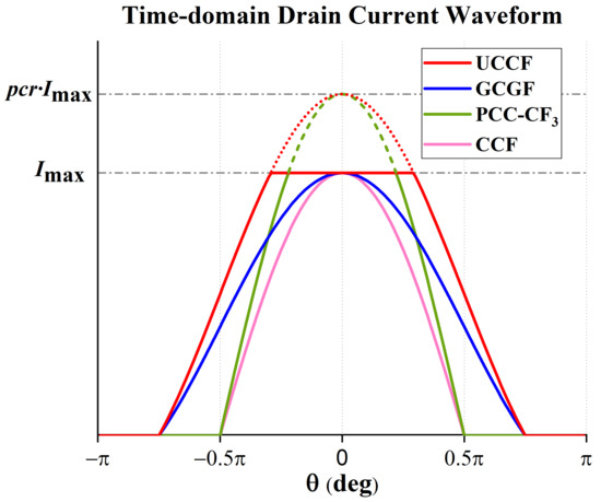 Transistor parasitic effects, including capacitance and inductance, are inherent imperfections that deviate from the ideal transistor behavior, as shown in Figure 1. These imperfections can profoundly affect the impedance characteristics of the circuit and pose significant challenges to achieve an accurately matched infinite third-harmonic-load impedance [24,25], especially at higher frequencies. In order to solve this problem, the recently proposed generalized continuous class F (GCCF) [26,27,28,29] mode and peak-clipped current continuous class F () mode [30] use relatively large finite third-harmonic load impedance as a substitute for infinite third-harmonic load impedance. As described in [26,27,28,29], the GCCF mode extends the drain current conduction angle of the continuous class F current waveform, thereby broadening the third-harmonic load impedance range. However, this diminishes the ratio between the current’s fundamental component and the DC component, leading to a substantial decrease in efficiency. In [30], the mode with a peak-clipped current generated by an overdriven transistor is proposed. Compared with the GCCF mode, the mode has a broader finite third-harmonic load impedance and reduced efficiency degradation. However, in the mode, the transistor works in a saturated state and therefore has nonlinear characteristics. Thus, in order to leverage the benefits of the GCCF and modes and strike a balance between linearity and efficiency, we propose the ultra-generalized continuous class F (UCCF) mode.