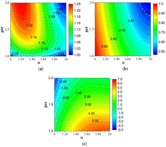 Figure 3a,b illustrate the variationin with and . When is the same, the peak-to-peak amplitude of decreases with an increase in . When stays the same, the peak-to-peak amplitude of increases with an increase in . This indicates that both and affect the input power, as an increase in decreases this parameter and an increase in increases it. These opposing trends lead to the different effects of and on the PA’s performance.