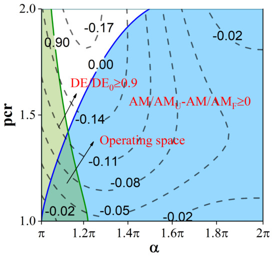 In Figure 8, the blue region indicates , while the green region indicates . The gray line in Figure 8 represents the contour line of . From Figure 7a, it can be observed that is greater than 1 throughout the entire plot. When choosing and , it is necessary to ensure that they fall in the overlapping area, called the operating space in Figure 8, to achieve a balance between efficiency and linearity.