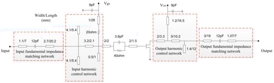 With the rapid development of wireless communication systems, the efficiency and linearity requirements of the power amplifier (PA) have increased. Previous work on harmonically tuned (HT) PAs [1,2,3,4,5,6,7,8,9] has achievedhigh efficiency and low loss by optimizing the output harmonic control circuit to shape the drain voltage and current waveforms. The class F PA, a typical HT PA, has garnered increased attention in the field of RF engineering [10,11,12,13,14,15,16,17,18]. This heightened interest has been driven by its unique ability to reduce the overlap between the voltage and current waveforms, substantially reducing power consumption. However, the notable limitation of the class F mode is its inherent narrowband operation.
