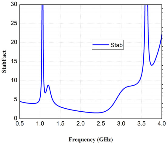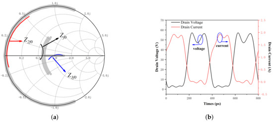 A schematic of the PA with the drain bias voltage set to V and the quiescent drain current set to 265 mA is shown in Figure 9. Since the theoretical analysis is conducted in the current source plane, parasitic parameter models [33] are required to transform the packaging plane into the current source plane. In this design, equals 1.17 and ranges from 1 to 1.2. The corresponding impedance space is shown in Figure 10. The working state used in this design has enhanced linearity and acceptable efficiency. The impedance trajectory of this design, shown in Figure 10a, aligns with the impedance space. In Figure 10b, the simulated voltage and current waveforms of the current source plane are depicted and are consistent with the theoretical design. As shown in Figure 11, the stability factor is close to 1 and greater than 1 in 2–2.6 GHz, and the stability factor is greater than 1 in the whole frequency band, which proves that the designed PA has good stability.
